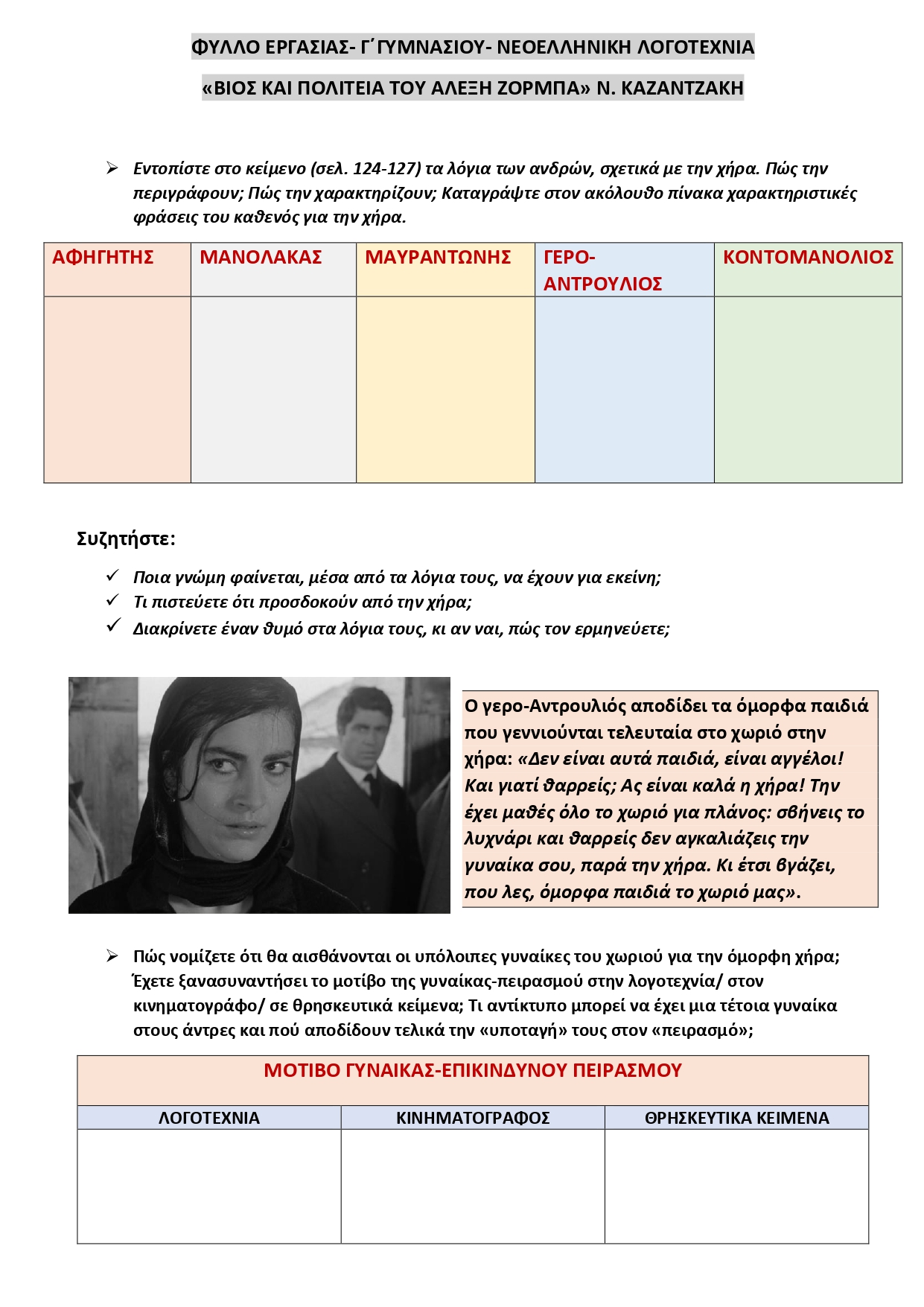 Αφού ζητήσουμε από τους μαθητές να εκφράσουν τις πρώτες σκέψεις και τα συναισθήματά τους για τον τραγικό θάνατο της χήρας, τους προβάλλουμε δύο μικρά αποσπάσματα από την ταινία "Ζορμπάς" (1964) του Μ. Κακογιάννη: το επεισόδιο με την απώλεια της κατσίκας και το επεισόδιο με τον λιθοβολισμό και την δολοφονία της χήρας. (το δεύτερο είναι διαθέσιμο ΕΔΩ). Επιχειρώντας να συγκρίνουμε το λογοτεχνικό κείμενο με την κινηματογραφική του μεταφορά, μπορούμε να θέσουμε τις ακόλουθες ερωτήσεις: