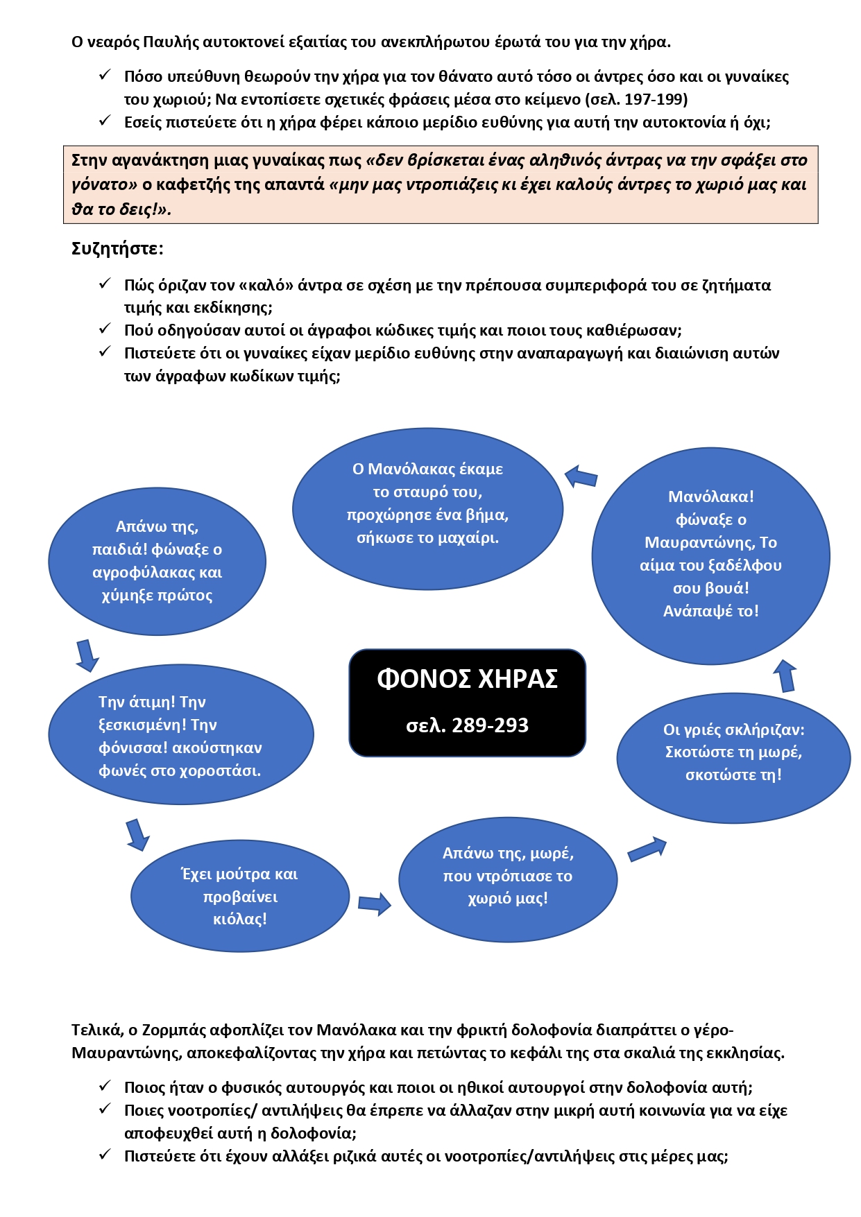 Χωρίζουμε τους μαθητές σε 3 ομάδες και τους μοιράζουμε τα φύλλα εργασίας: η πρώτη ομάδα θα ασχοληθεί με το απόσπασμα όπου παρουσιάζεται η χήρα, η δεύτερη ομάδα με την αυτοκτονία του Μαυραντώνη και η τρίτη με την δολοφονία της χήρας. Αφήνουμε στους μαθητές 1 ώρα να εργαστούν ομαδικά και να συμπληρώσουν τις ερωτήσεις του φύλλου εργασίας που αντιστοιχούν στην ομάδα τους. Δείτε το φύλλο εργασίας (υπάρχει και ως συνημμένο στο τέλος της σελίδας)