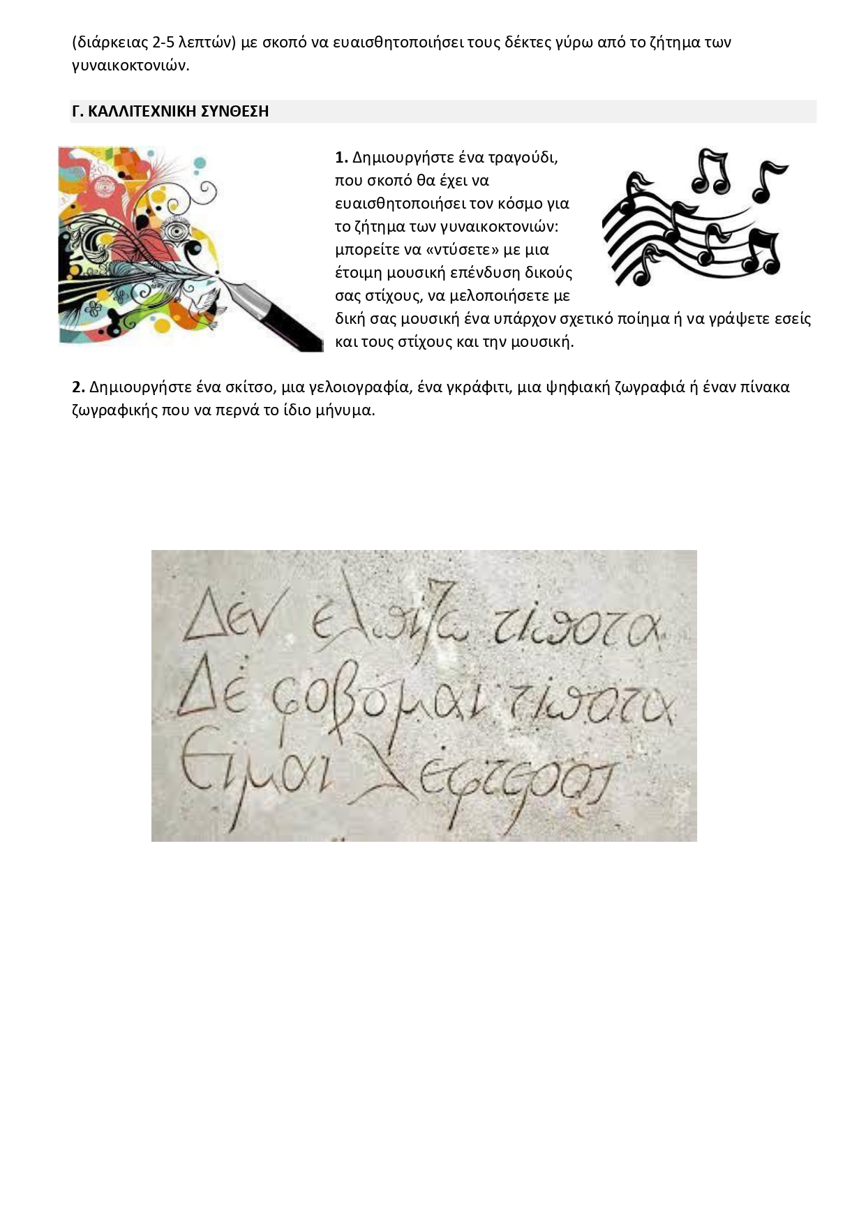 Προβάλλουμε στους μαθητές μια παρουσίαση που δημιουργήσαμε με τίτλο "φάκελος γυναικοκτονίες": στην παρουσίαση περιέχονται αποσπάσματα με περιπτώσεις (πρόσφατων) γυναικοκτονιών από τον ημερήσιο ηλεκτρονικό τύπο. Τους καλούμε να εντοπίσουν την (κοινή) δικαιολογία που προβάλλουν οι δράστες για το έγκλημά τους ("μου ζήτησε να χωρίσουμε", "ήθελε διαζύγιο", "θόλωσα από την ζήλια και την αγάπη" κ.α.) και να αναζητήσουν τα βαθύτερα αίτια, τις στερεοτυπικές πατριαρχικές αντιλήψεις που οδηγούν σε κακοποιητικές συμπεριφορές σε βάρος των γυναικών, με κορύφωση την γυναικοκτονία.