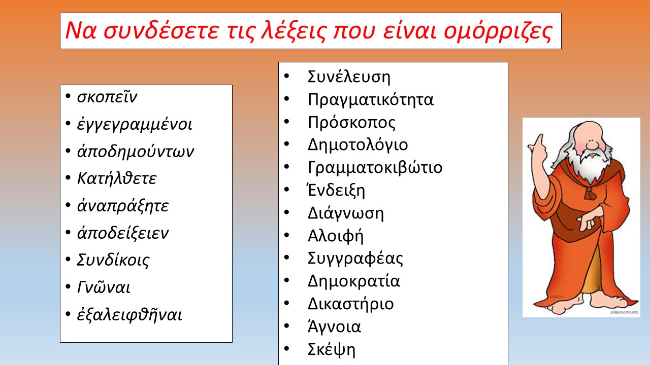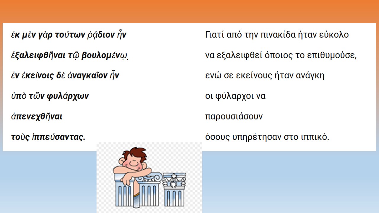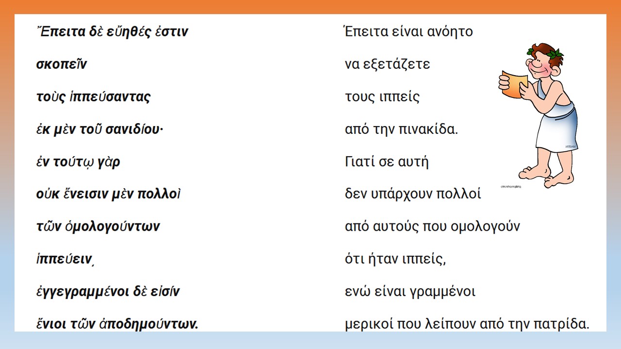 Οπτικοποίηση του αρχαίου κειμένου με την μορφή κόμικ για ευκολότερη γλωσσική εξομάλυνση, κατανόηση και ερμηνευτική προσέγγιση. Ακολουθεί το κείμενο με την μετάφραση, ερμηνευτικές ερωτήσεις και λεξιλογικές ασκήσεις της ενότητας.