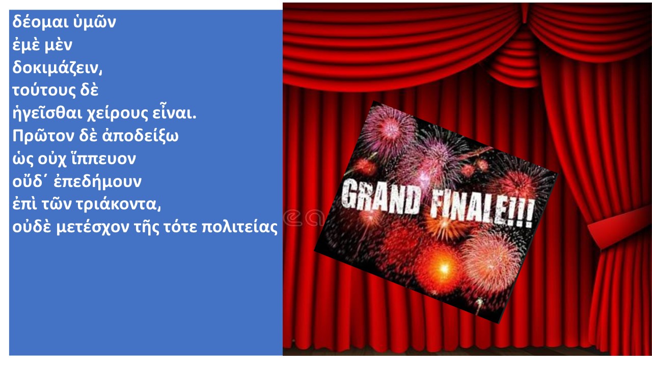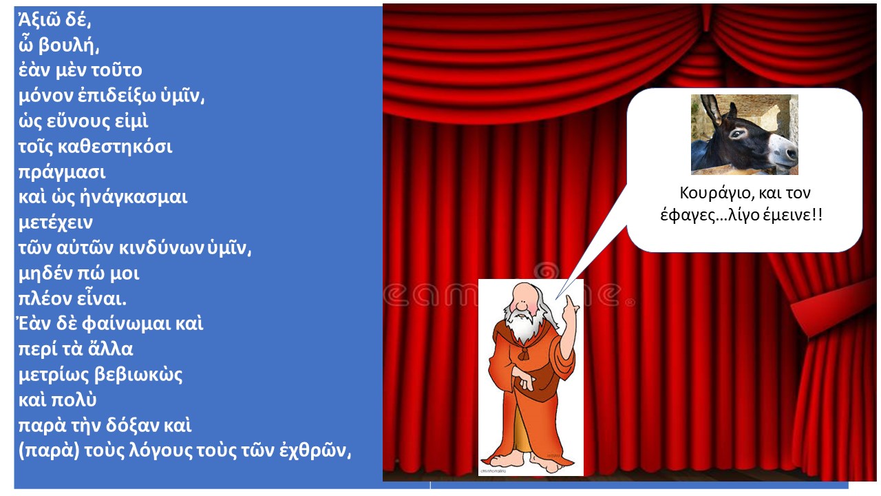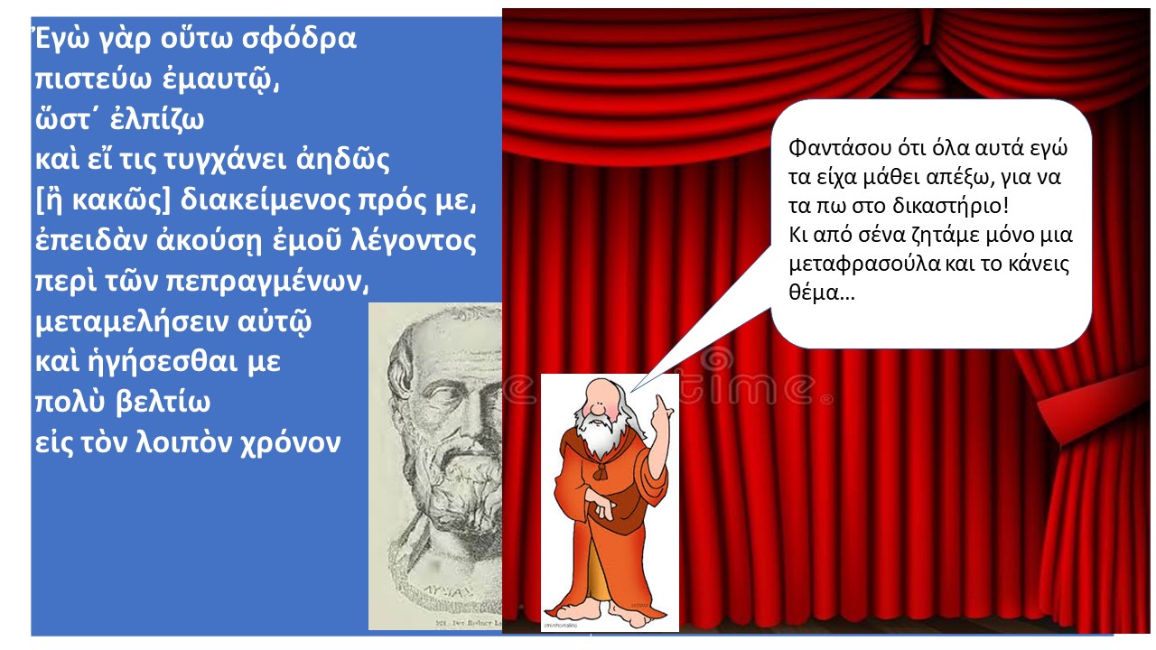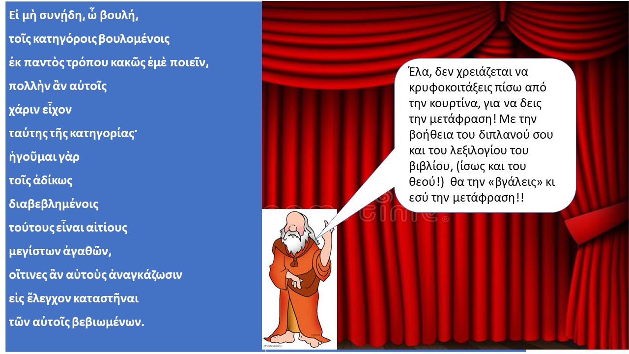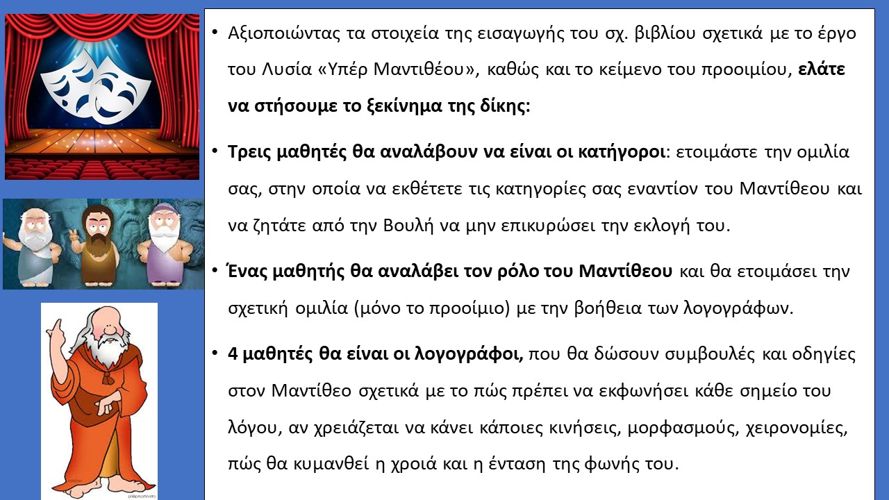 Προβάλλουμε στους μαθητές p.point κι εκείνοι προσπαθούν, με την βοήθεια του λεξιλογικού πίνακα του σχ. βιβλίου, να εξομαλύνουν γλωσσικά το κείμενο και να το μεταφράσουν στην νέα ελληνική. Ο Μαντίθεος "ανοίγει" κάθε φορά την κουρτίνα και αποκαλύπτει πόσο "κοντά" ή "μακριά" έπεσαν οι μαθητές. Στο τέλος, τους συγχαίρει κι εκείνοι θα πρέπει να χωριστούν σε ομάδες και να δραματοποιήσουν την πρώτη σκηνή της δίκης στο δικαστήριο... Ακουλουθεί φύλλο εργασίας με επιλογή ασκήσεων από την Τράπεζα Θεμάτων.