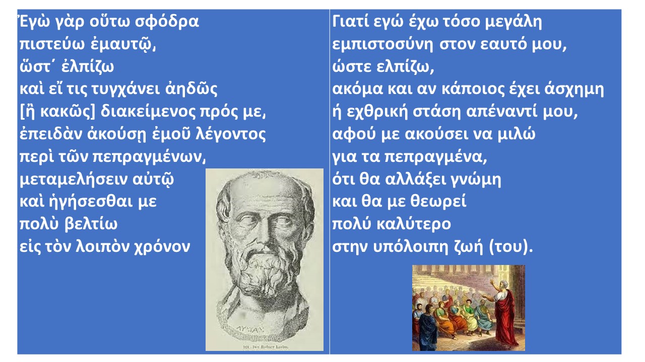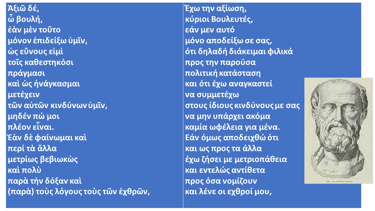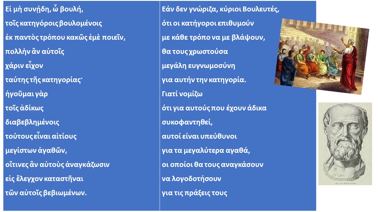 Λίγο ακόμα και θα εξέφραζα την ευγνωμοσύνη μου, μέλη της βουλής, στον κατήγορο, που μεθόδευσε εναντίον μου αυτή εδώ τη δίκη. Διότι ενώ προηγουμένως δεν είχα αφορμή για να λογοδοτήσω για τη ζωή μου, τώρα, εξαιτίας του, μου έχει δοθεί. Και θα προσπαθήσω με τον λόγο μου να αποδείξω αφενός ότι αυτός ψεύδεται, αφετέρου ότι εγώ έχω ζήσει έως τούτη την ημέρα με τρόπο που αξίζει έπαινο παρά φθόνο. Γιατί έχω την αίσθηση ότι μεθόδευσε αυτή εδώ τη δίκη εναντίον μου όχι για κάποιο άλλο λόγο, αλλά από φθόνο. Ωστόσο, ένας που φθονεί αυτούς που οι άλλοι τους οικτίρουν, από ποιά αχρειότητα νομίζετε ότι θα κρατηθεί μακριά ένα τέτοιο πρόσωπο; Γιατί αν βέβαια με συκοφαντεί για χρήματα-. Αν πάλι με εκδικείται ως εχθρό του, ψεύδεται. Γιατί λόγω της αχρειότητάς του ποτέ έως τώρα δεν τον είχα ούτε φίλο ούτε εχθρό. Είναι ήδη σαφές, μέλη της βουλής, ότι με φθονεί, διότι, ενώ αντιμετωπίζω τέτοια συμφορά, είμαι πολίτης καλύτερος από αυτόν. Διότι έχω την άποψη πως πρέπει, μέλη της βουλής, να θεραπεύει κανείς τα ελαττώματα του σώματος με τα προτερήματα της ψυχής. Γιατί αν η σκέψη μου εξισωθεί με τη συμφορά και ζήσω ανάλογα την υπόλοιπη ζωή μου, σε τί θα διαφέρω από αυτόν;