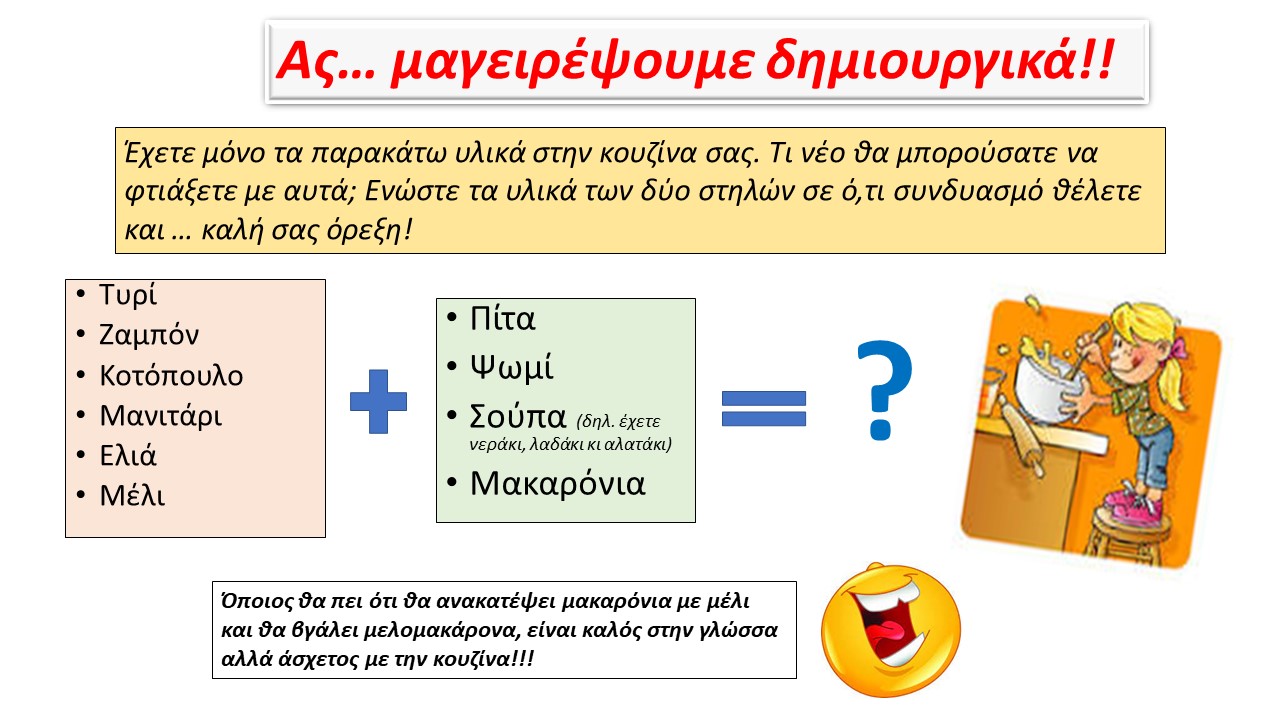 (Ας θυμηθούμε ένα δικό μας παραμύθι: «Ο κακός λύκος προχώρησε μέσα στο δάσος και έφτασε έξω από το σπιτάκι της μαμάς-κατσίκας. Χτυπάει τότε δυνατά την πόρτα και λέει με γλυκιά φωνή...)