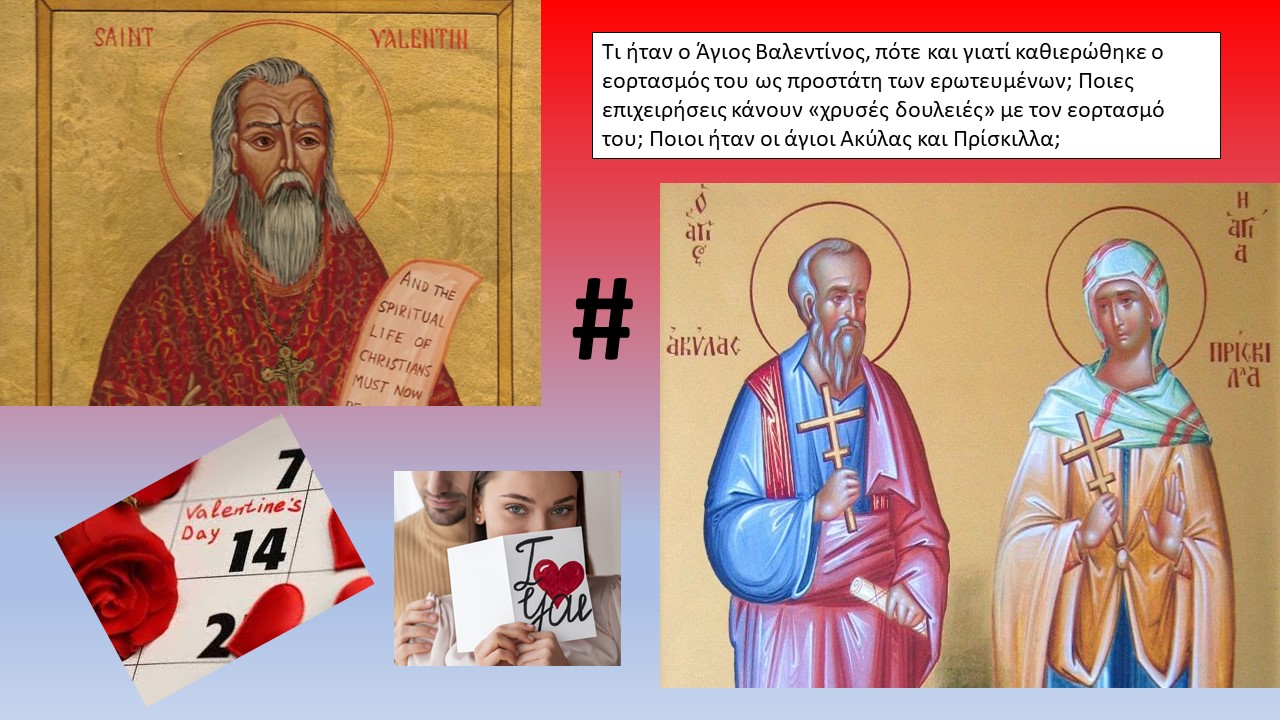 - Να συνειδητοποιήσουν τον εμπορικό χαρακτήρα της γιορτής του Αγίου Βαλεντίνου και να γνωρίσουν τους αντίστοιχους ορθόδοξους αγίους και την δράση τους. Να γνωρίσουν της διαφορετική διάσταση της έννοιας του έρωτα μέσα από την χριστιανική οπτική.