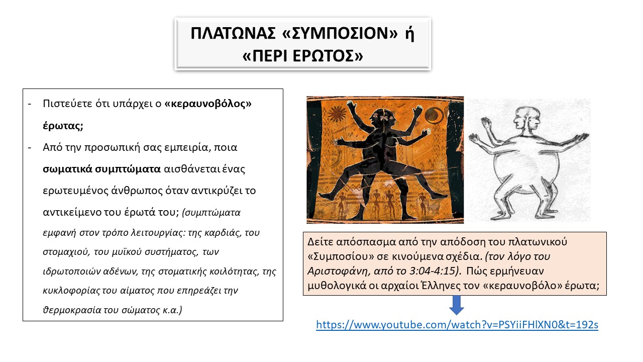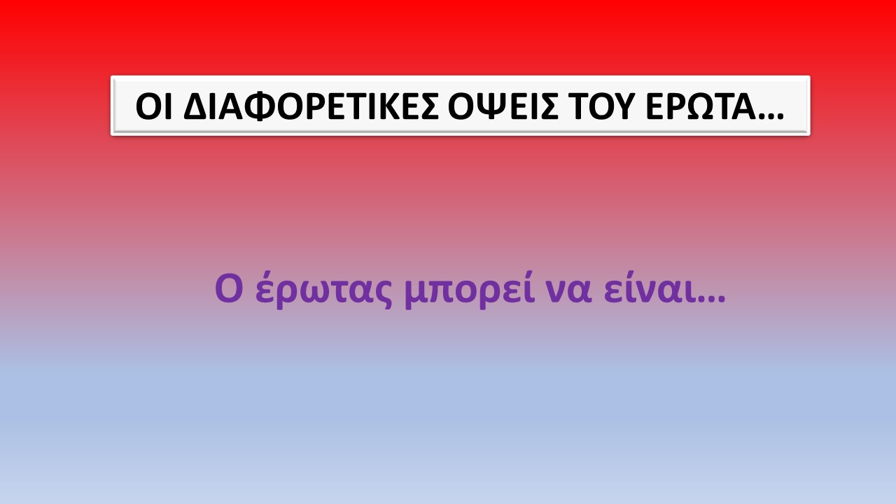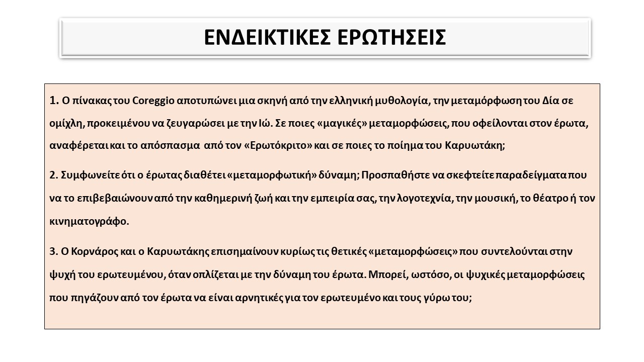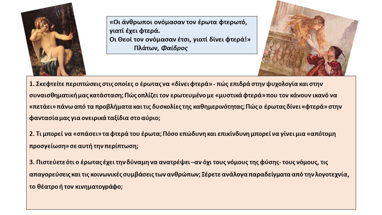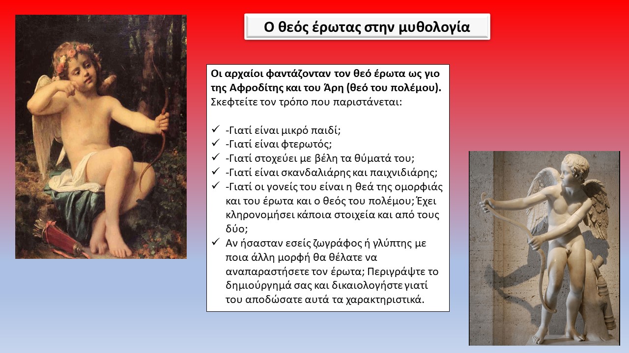 - Οι αρχαίοι φαντάζονταν τον έρωτα ως ένα μικρό, σκανδαλιάρικο, γυμνό παιδί που κρατάει τόξο και βέλη και έχει φτερά. Αν ήσασταν εσείς ζωγράφος, με ποια άλλη μορφή θα θέλατε να αναπαραστήσετε τον έρωτα; Ζωγραφίστε ή περιγράψτε το δημιούργημά σας και δικαιολογήστε γιατί του αποδώσατε αυτά τα χαρακτηριστικά.