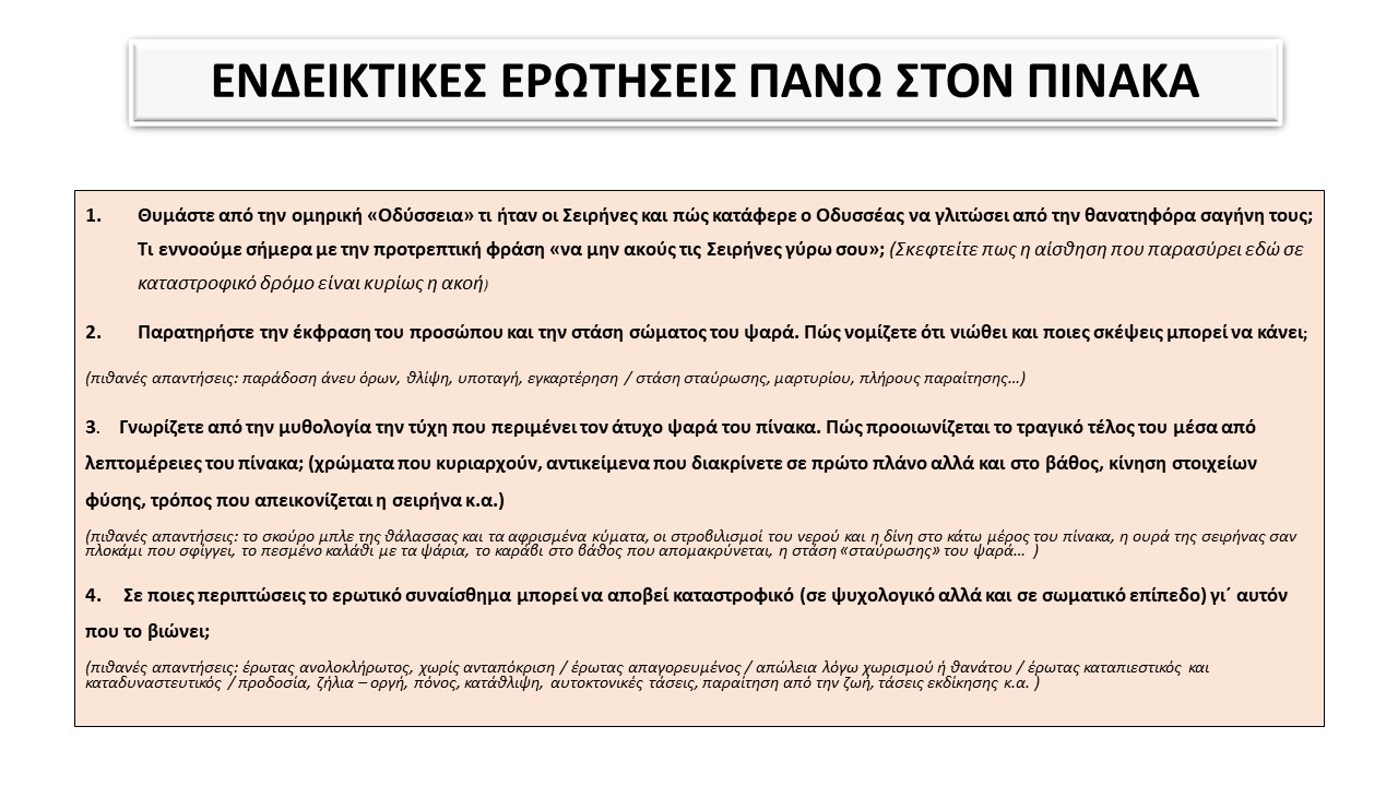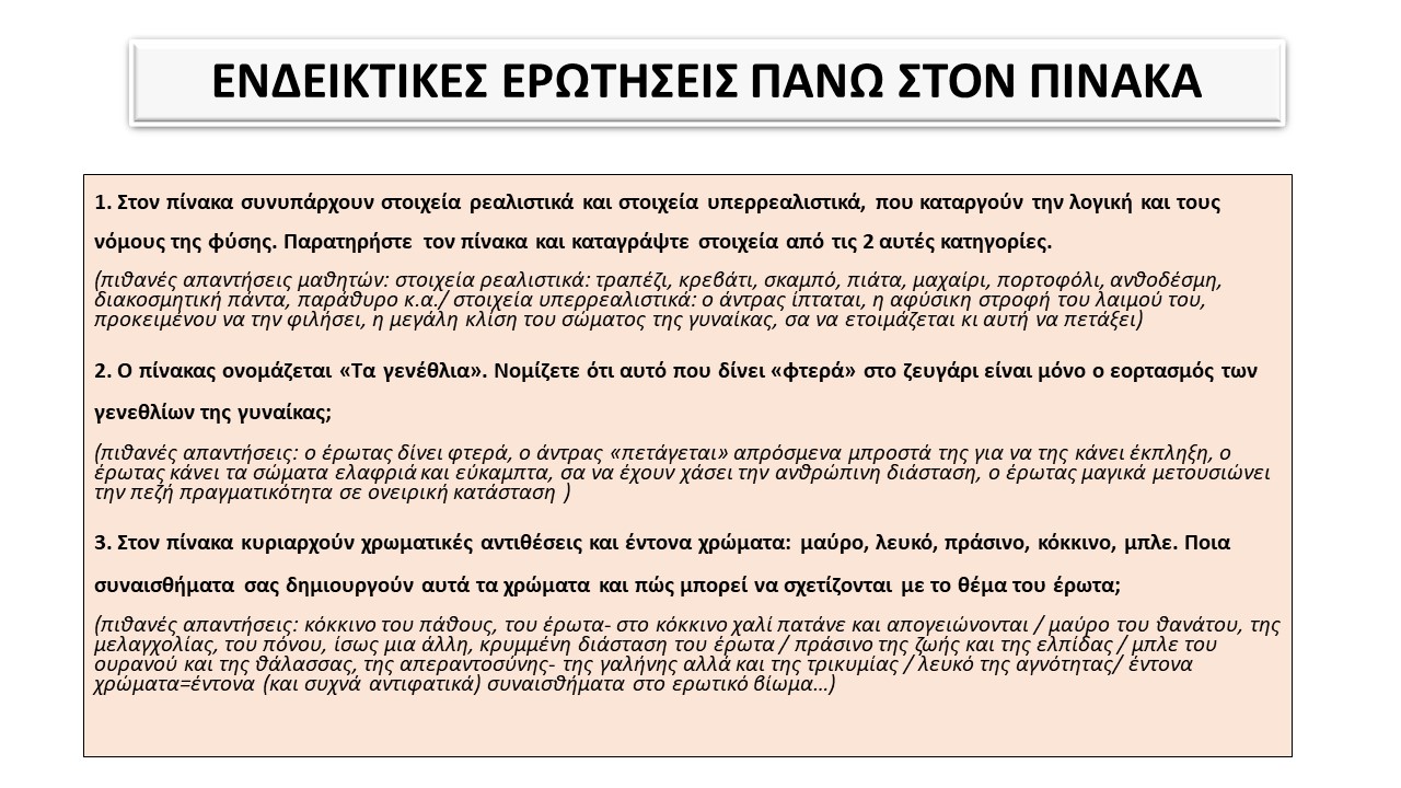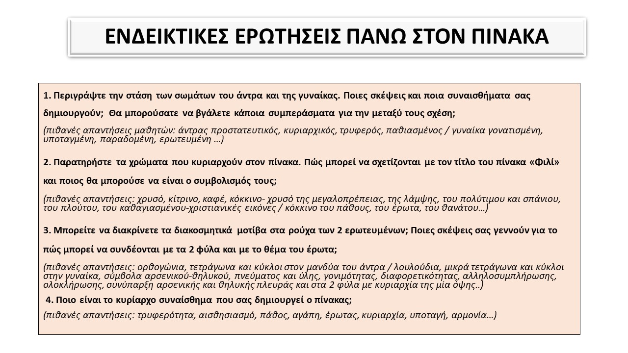 - Να καλλιεργήσουν τον οπτικό και κριτικό γραμματισμό μέσα από την παρατήρηση, την ανάλυση, τον συσχετισμό και τον παραλληλισμό ερωτικών ποιημάτων με γνωστά έργα ζωγραφικής.