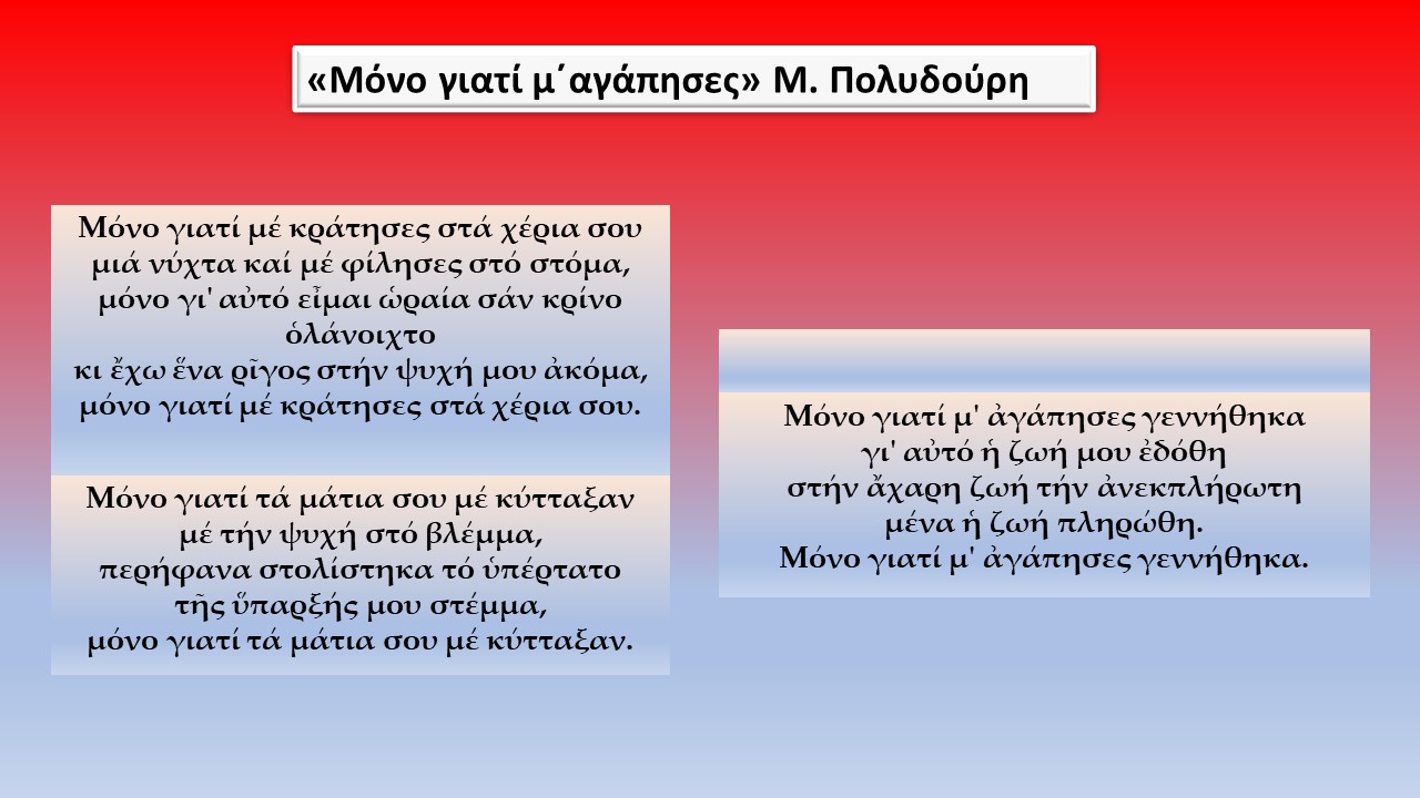 - Επιλέξτε όποιο ποίημα θέλετε, από αυτά που είδαμε, και αντιγράψτε το σε μια σελίδα του Word. Στην συνέχεια, εμπλουτίστε το ποίημα με "εισαγωγή υπερσυνδέσμου" με εικόνες-πίνακες ζωγραφικής ή φωτογραφίες που θα βρείτε στο διαδίκτυο και πιστεύετε ότι "οπτικοποιούν" το περιεχόμενο κάποιων στίχων. Εναλλακτικά: δημιουργήστε μια παρουσίαση (p.point) με εικόνες, στίχους του ποιήματος και μουσική επένδυση.