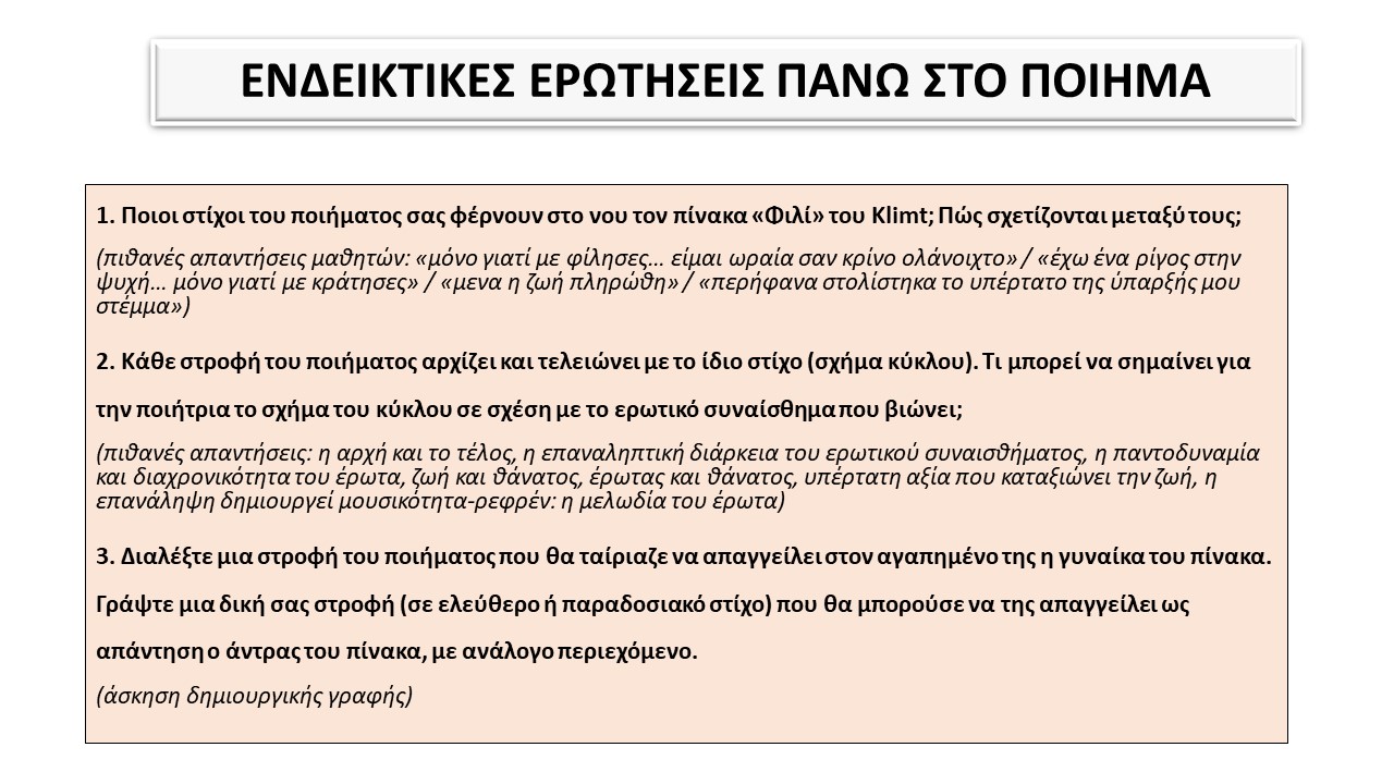 - Διαλέξτε μια στροφή του ποιήματος "Μόνο γιατί μ΄ αγάπησες" που θα ταίριαζε να απαγγείλει στον αγαπημένο της η γυναίκα του πίνακα του Klimt "Το φιλί". Γράψτε μια δική σας στροφή (σε ελεύθερο ή παραδοσιακό στίχο) που θα μπορούσε να της απαγγείλει ως απάντηση ο άντρας του πίνακα, με ανάλογο περιεχόμενο. Μπορείτε να "δώσετε φωνή" στον πίνακα, αν θέλετε, μέσα από την δωρεάν ψηφιακή εφαρμογή "ThingLink"