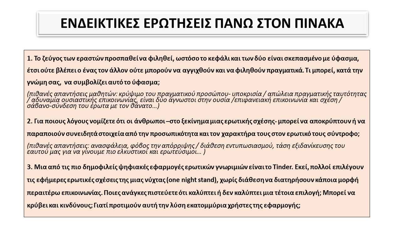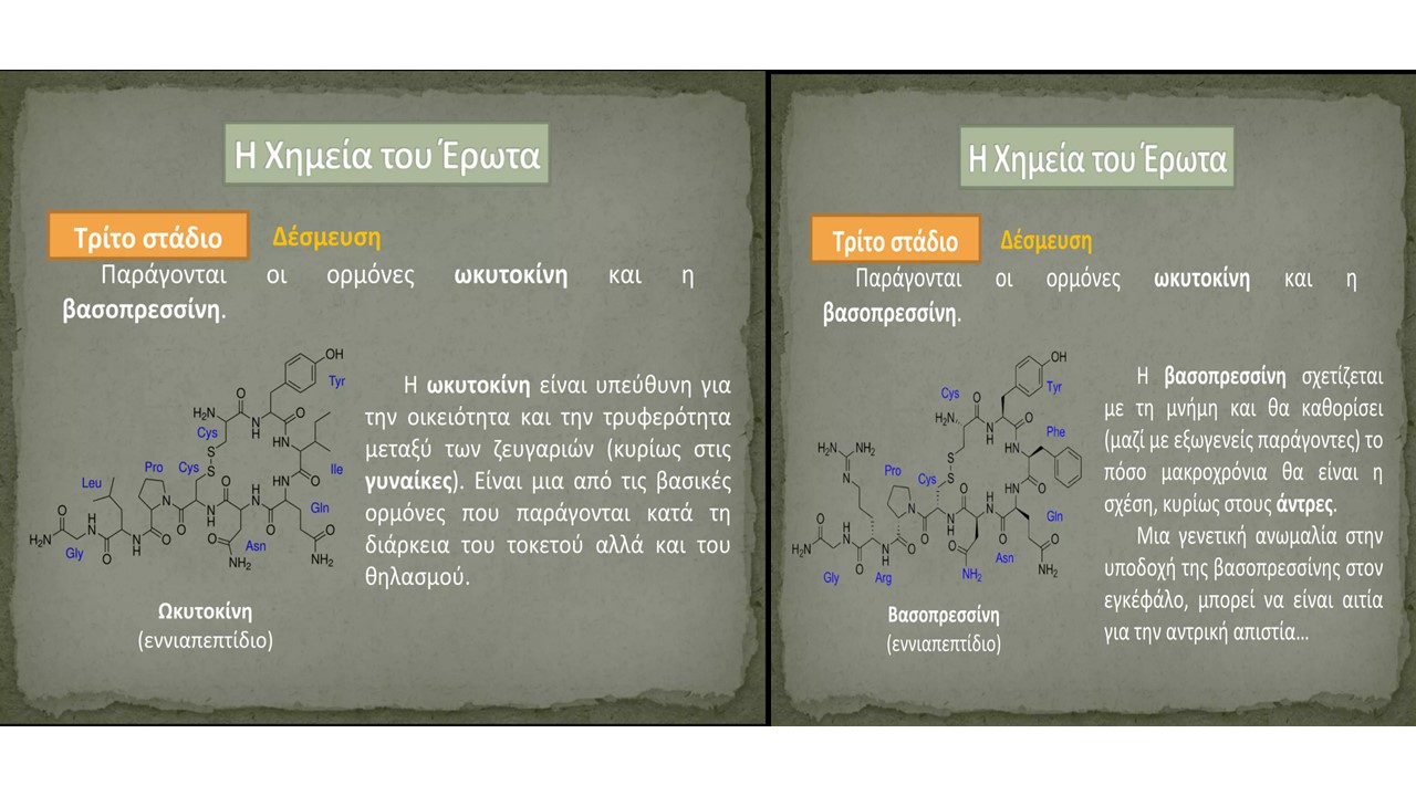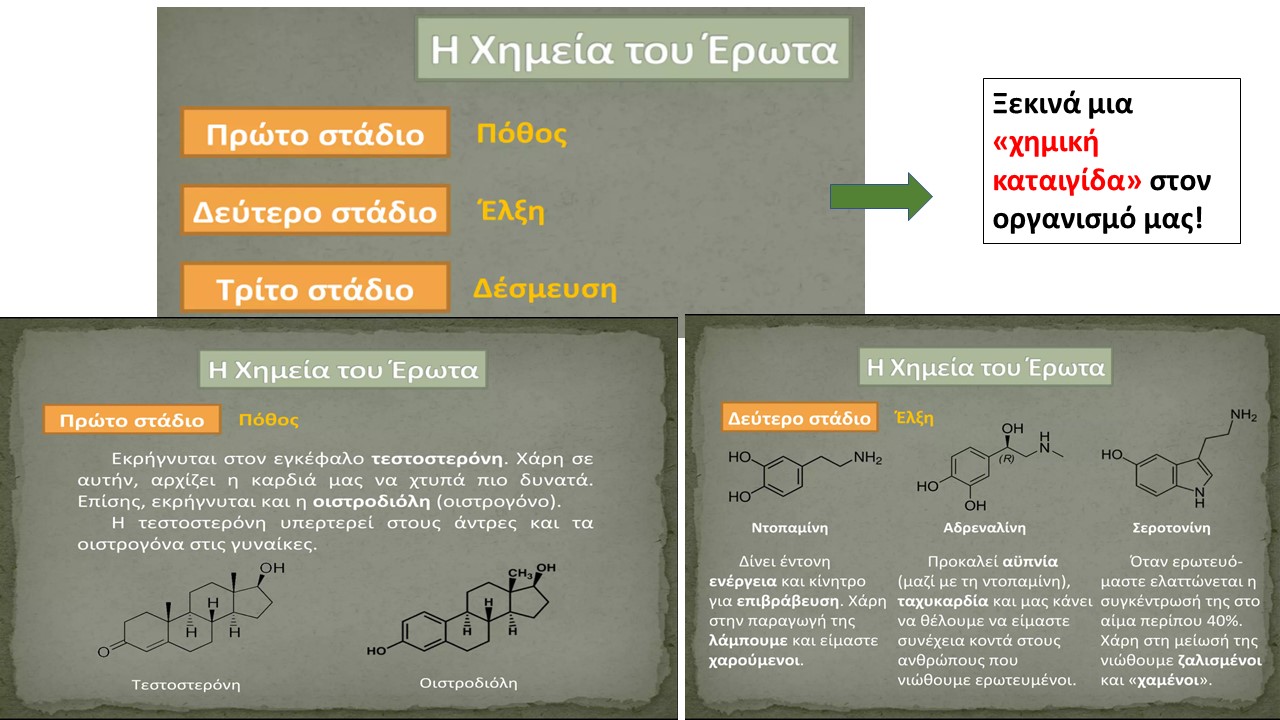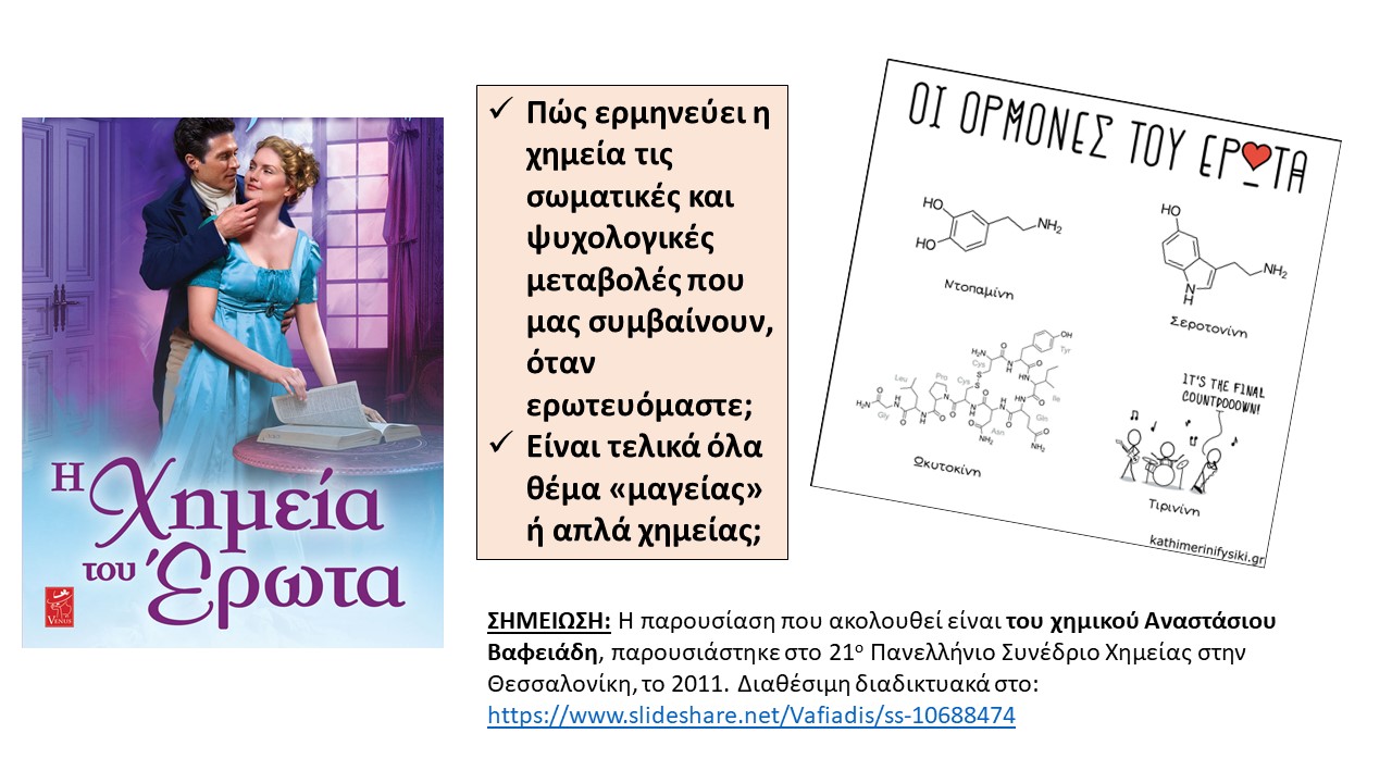 Η διδακτική πρόταση εφαρμόστηκε σε συνδιδασκαλία Γ΄ γυμνασίου και Α΄ λυκείου (σε εσπερινό γυμνάσιο με λυκειακές τάξεις) και με την συνεργασία του θεολόγου, κου Ιωαννίδη Γιώργου, και της χημικού του σχολείου μας, κυρίας Τσώτα Βασιλικής, στις 14 Φλεβάρη, με αφορμή τον εορτασμό του Αγίου Βαλεντίνου. Βασίζεται στην ολιστική, διαθεματική και βιωματική μάθηση- λόγω περιορισμένου χρόνου και μεγάλης έκτασης του θέματος δεν εφαρμόσαμε ομαδοσυνεργατικές πρακτικές με φύλλα εργασίας, αλλά η διδακτική πρόταση βασίστηκε σε μια παρουσίαση και στον κατευθυνόμενο διάλογο, με ερωτήσεις διαβαθμισμένης δυσκολίας σύμφωνα με την ταξινόμηση του Bloom (ερωτήσεις κατανόησης, εφαρμογής, ανάλυσης, σύνθεσης, αξιολόγησης) και με ασκήσεις δημιουργικής γραφής, που μπορούν να ανατεθούν στο σπίτι, με ελεύθερη επιλογή των μαθητών, αν ο διαθέσιμος χρόνος εφαρμογής της πρότασης είναι περιορισμένος.