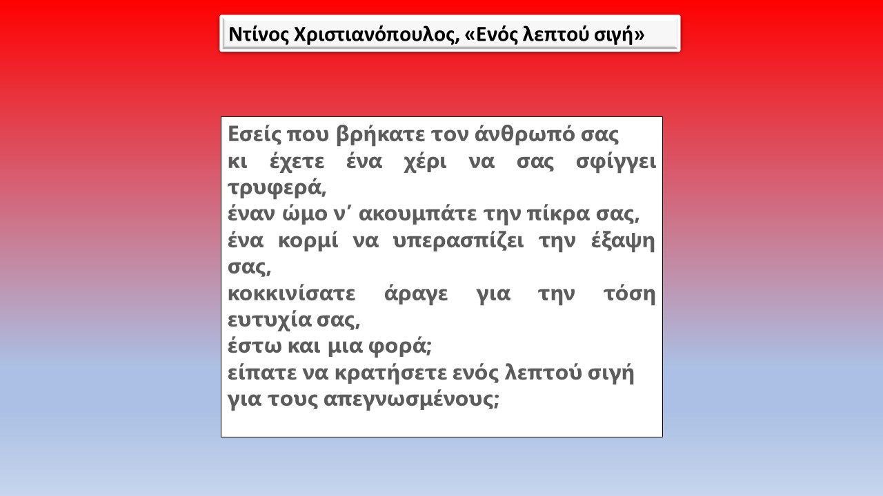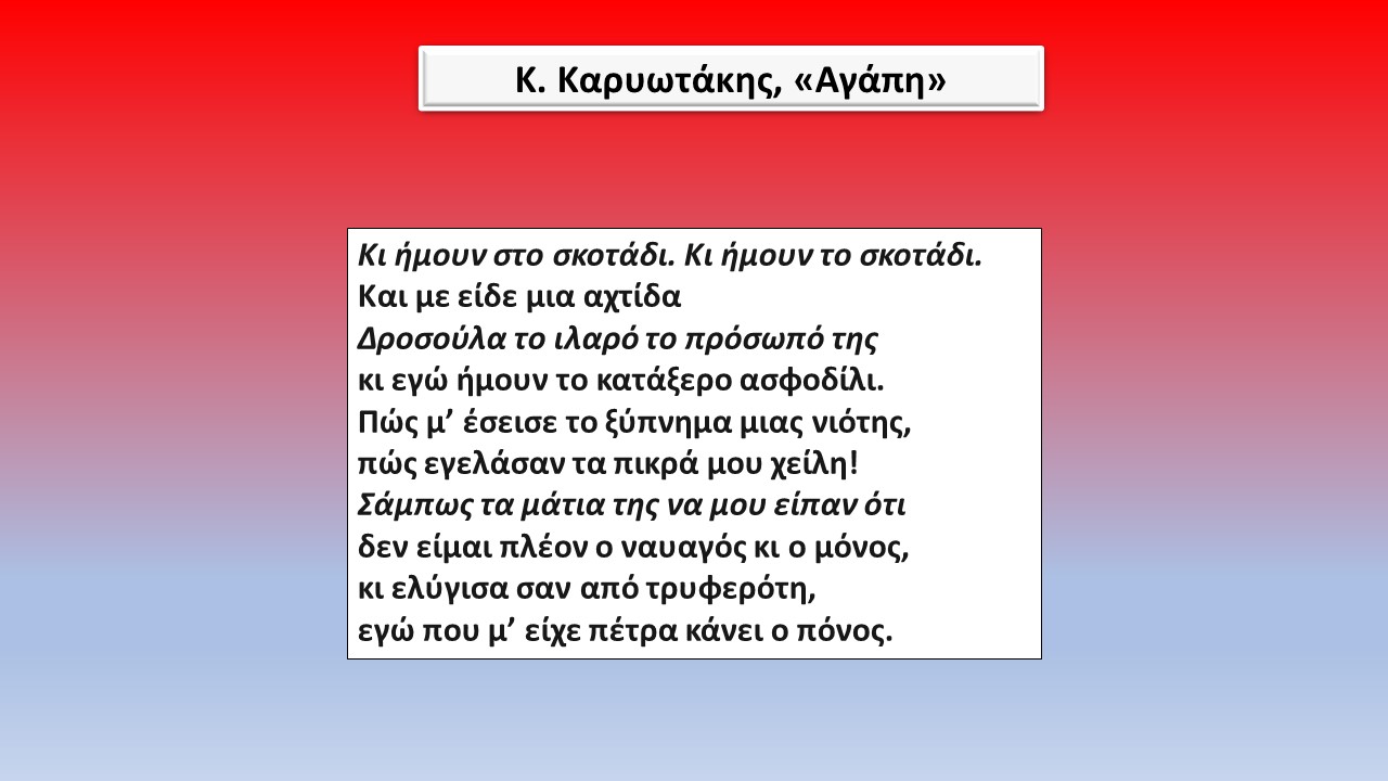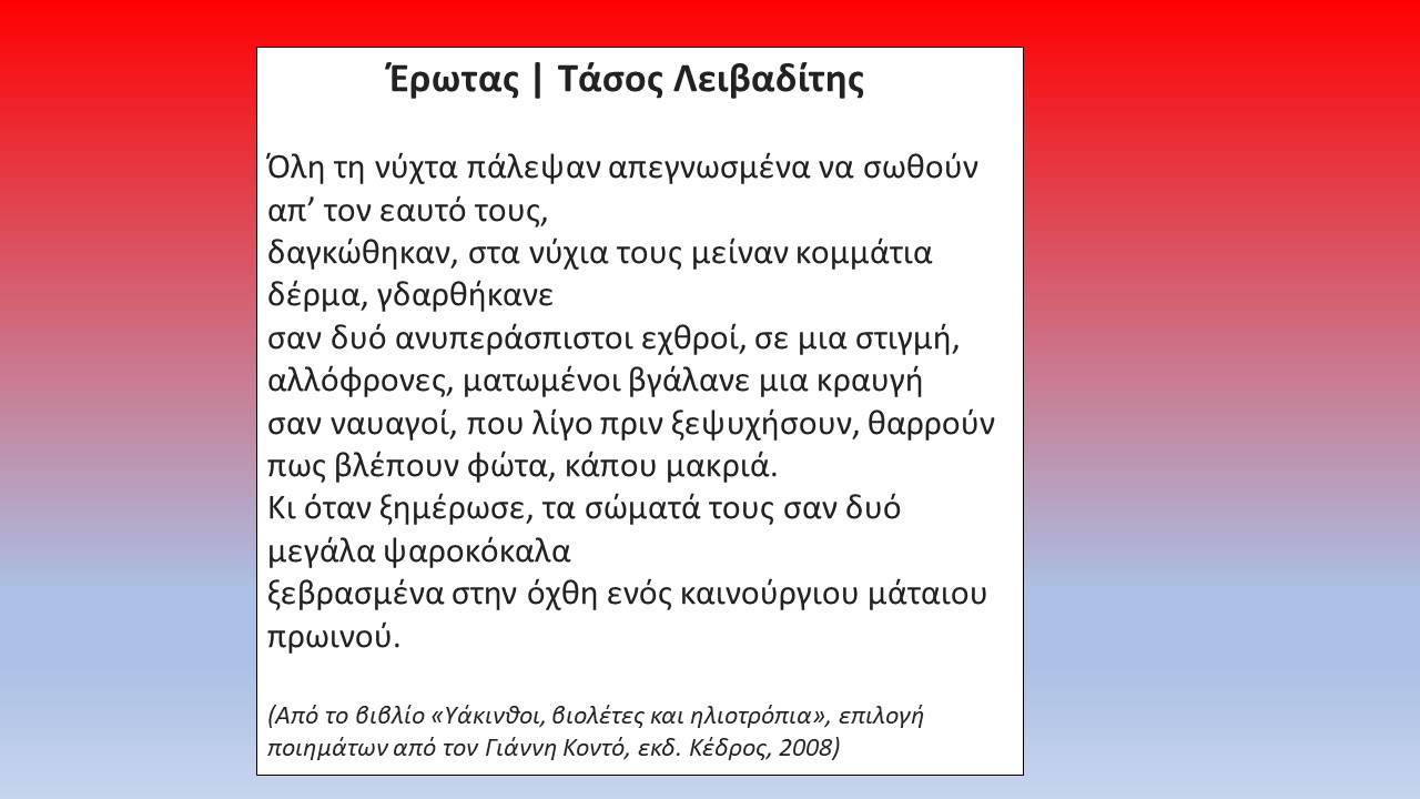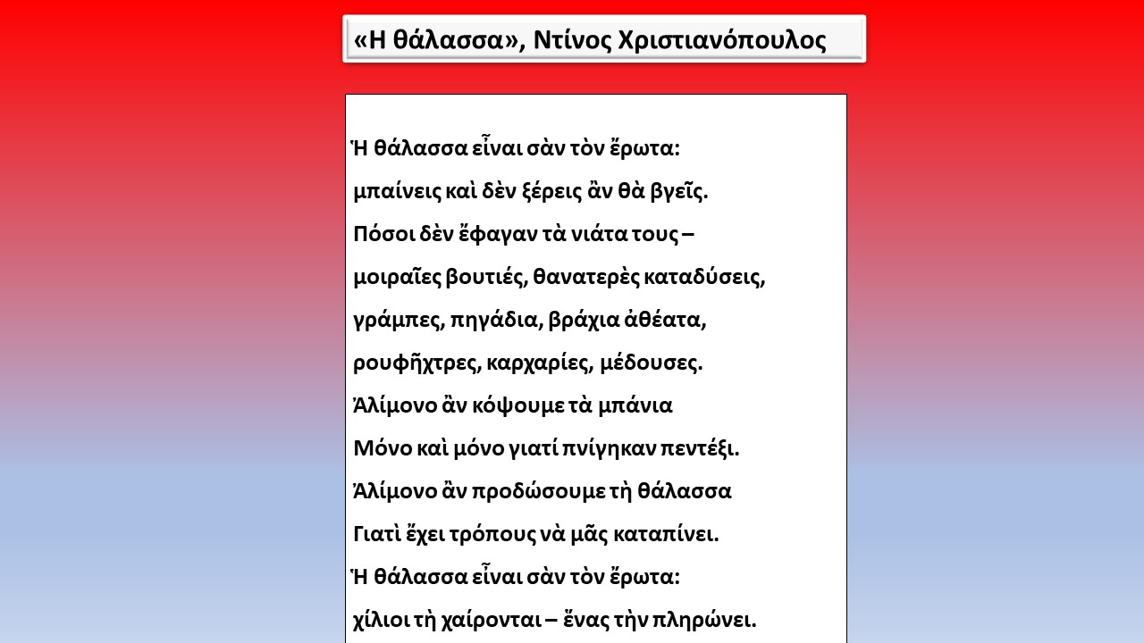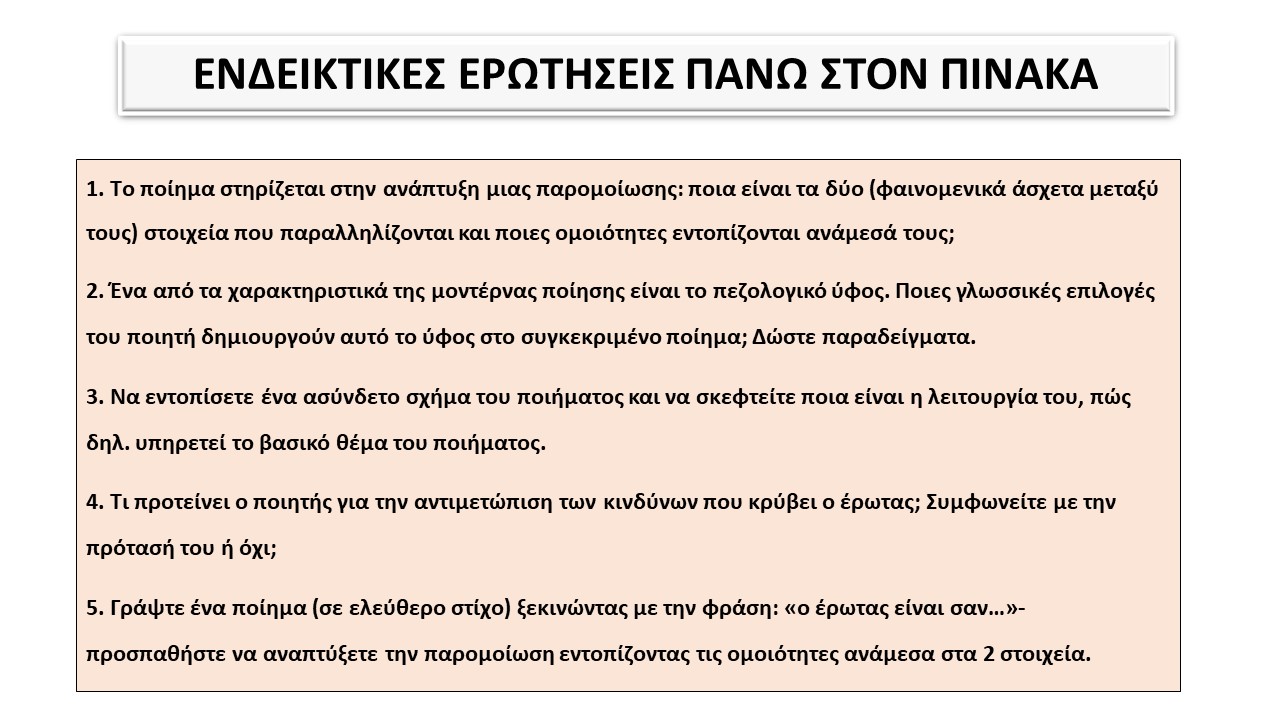 - Με αφορμή του ποίημα του Χριστιανόπουλου "Η θάλασσα", γράψτε ένα ποίημα (σε ελεύθερο ή παραδοσιακό στίχο) που να ξεκινάει με τον στίχο "Ο έρωτας είναι σαν...". Προσπαθήστε να αναπτύξετε την παρομοίωση, εντοπίζοντας τις ομοιότητες ανάμεσα στα 2 στοιχεία.