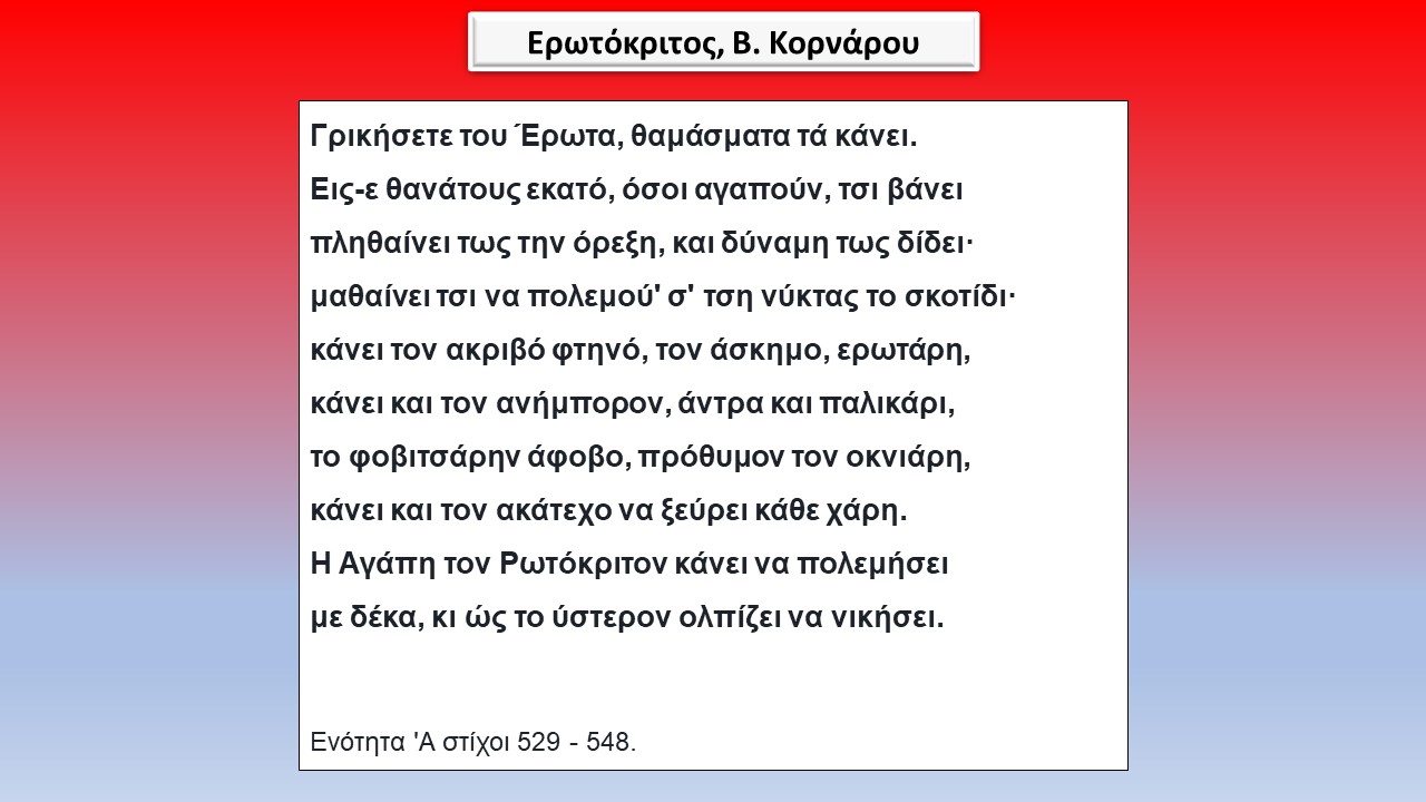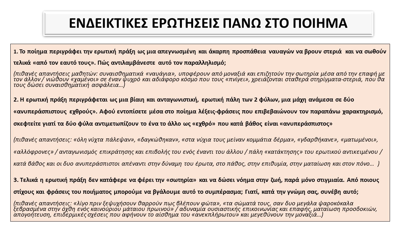 - Να προσεγγίσουν οι μαθητές την ερωτική ποίηση ολιστικά και διαθεματικά, σε σχέση με την εικαστική τέχνη, την μυθολογία, την αρχαία ελληνική γραμματεία, την θεολογία και την επιστήμη της χημείας.
