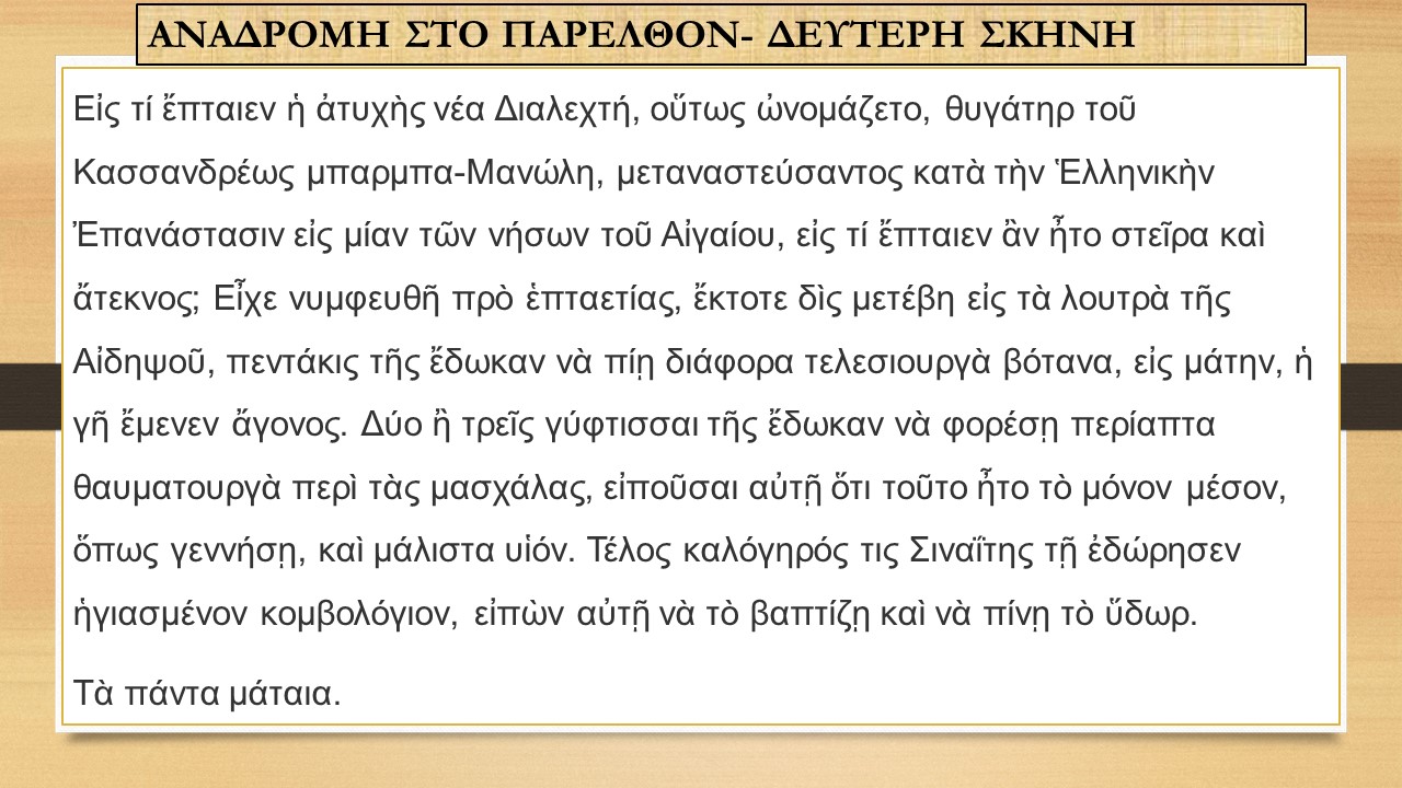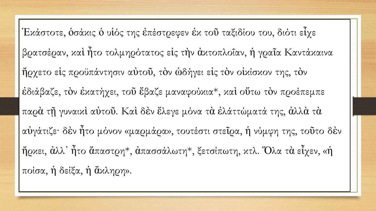 - Να εξοικειωθούν με τους αναβαθμούς της παπαδιαμαντικής γλώσσας (αρχαιοπρεπής γλώσσα στις περιγραφές, πιο "ανάλαφρη" καθαρεύουσα με στοιχεία δημοτικής στις αφηγήσεις, απλή δημοτική με σκιαθίτικους ιδιωματισμούς στους διαλόγους) και να συνδέσουν την απλή, δημοτική γλώσσα των διαλογικών μερών με την συνθήκη αληθοφάνειας των ηρώων.