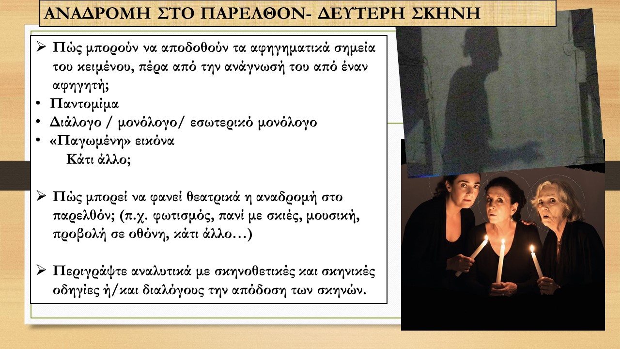 -Να μπορούν να οργανώνουν τον δραματικό χρόνο επιλέγοντας με δημιουργικούς αυτοσχεδιασμούς τον τρόπο με τον οποίο θα αποδοθούν επί σκηνής αναδρομικές αφηγήσεις (σκηνές στο παρελθόν).