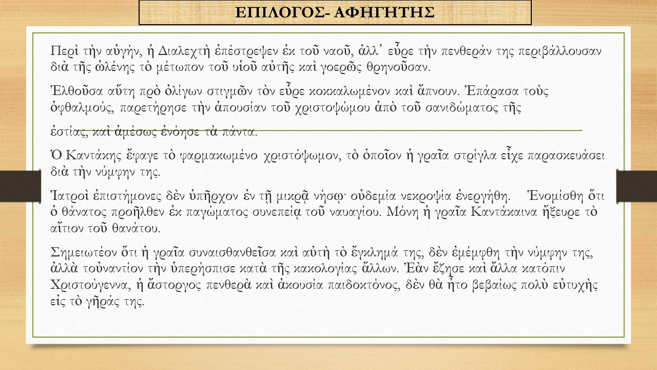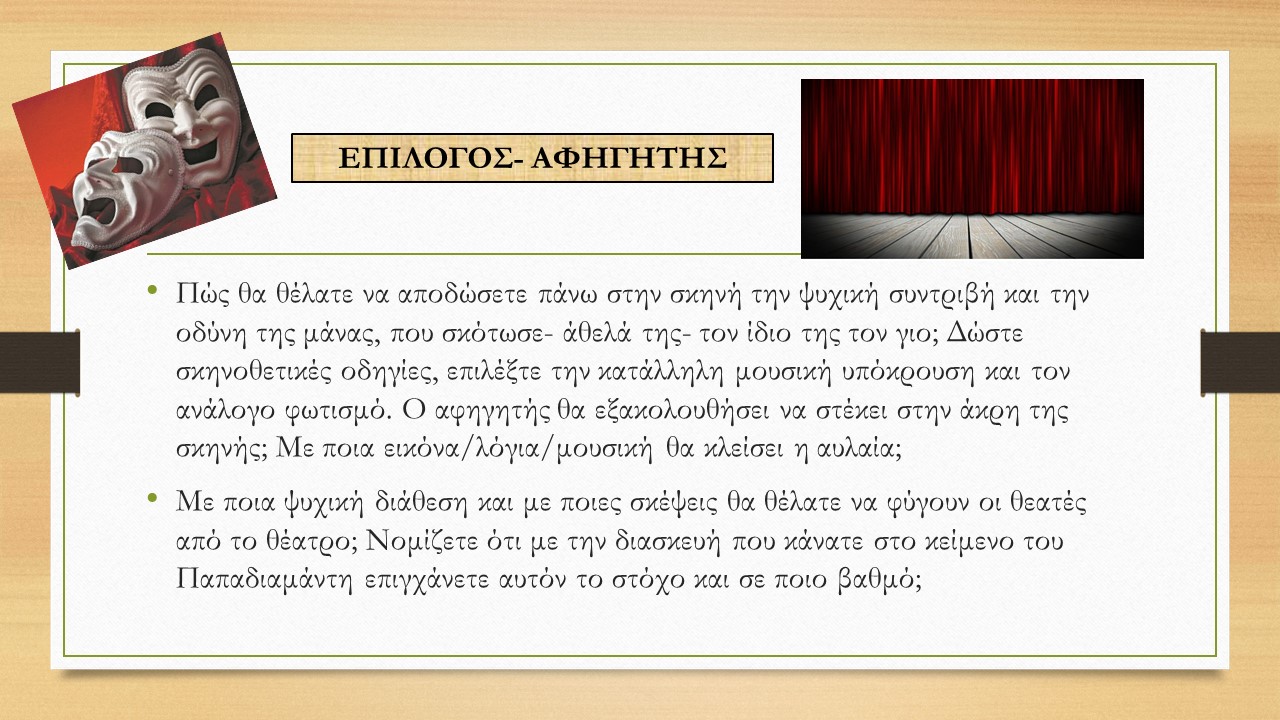 -Να αναγνωρίζουν τα στοιχεία θεατρικότητας που υπάρχουν στο παπαδιαμαντικό έργο (δραματικός χρόνος και τόπος, διάκριση ενοτήτων δράσης, στοιχεία πλοκής, χαρακτήρες, συγκρούσεις, τραγικότητα ηρώων, δραματικά απρόοπτα, στοιχεία προοικονομίας κ.α.), καθώς και την λειτουργία που επιτελούν μέσα στο έργο.