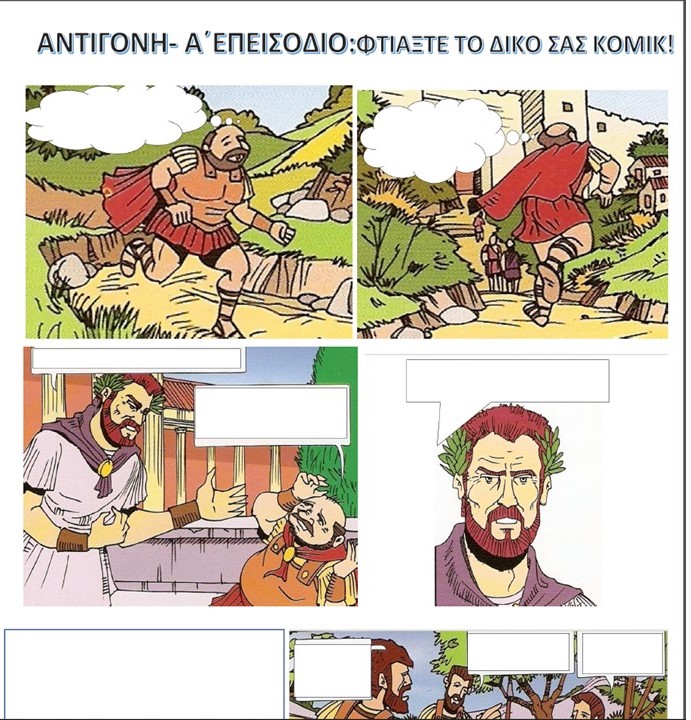 Διδακτική πρόταση που στηρίζεται στην διδασκαλία της αρχαίας με comics. Δημιουργία: Φλωριανού Ελένη. Αφού έχουμε διαβάσει και σχολιάσει τον μονόλογο του φύλακα, οι μαθητές χωρίζονται σε ομάδες στις οποίες μοιράζουμε κόμικ με κενές λεζάντες, τις οποίες καλούνται να συμπληρώσουν. (Από την "Αντιγόνη" του Σοφοκλή σε κόμικ των Αποστολίδη- Αρώνη, εκδ....